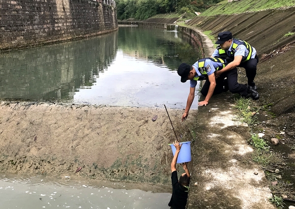 安全抵达绿化带后,男子心有余悸,他告知,自己50多岁,永昌镇居民,爱好钓鱼,早上下雨过后就出门了,认为雨后鱼儿易上钩,准备从河堤斜坡下行到河坎边垂钓,但由于斜坡非常打滑,脚踩上去就溜滑翻滚下坡掉进了河道里,左腿受了伤。他表示,幸好水流不是很凶猛,水深不是太深,在水里浸泡有30多分钟,又幸好有走路群众看见帮忙报了警,得到了民警的及时救助。