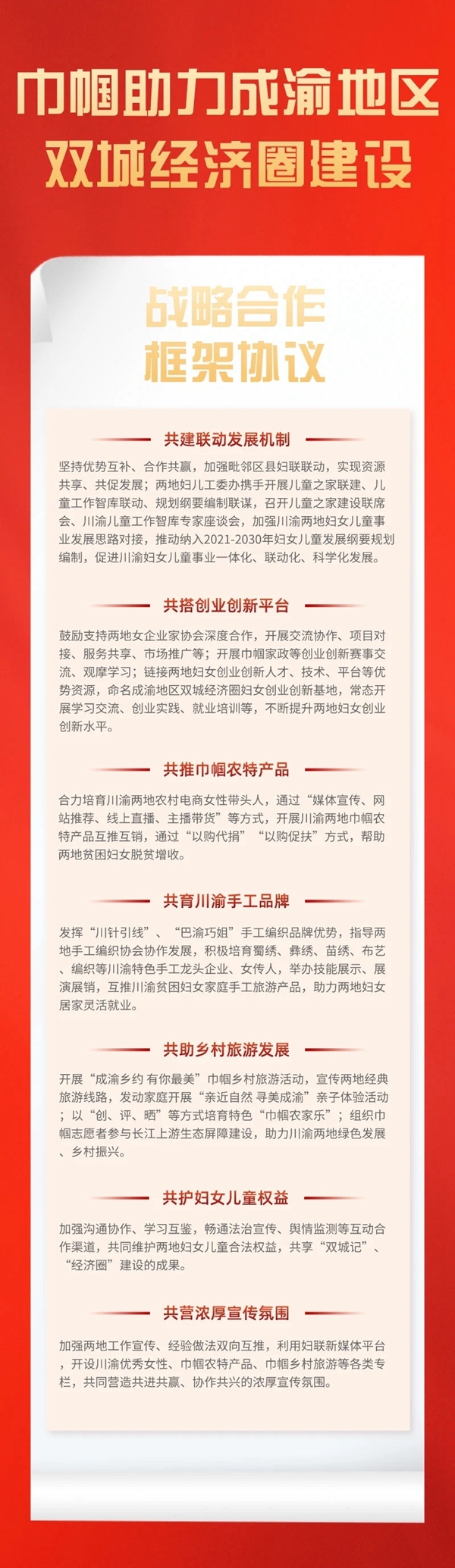 为全面落实四川重庆合作推动成渝地区双城经济圈建设工作方案,联动川渝姐妹,唱好“双城记”,建好“经济圈”,为建设高品质生活宜居地贡献巾帼力量,川渝各地姐妹这样做: