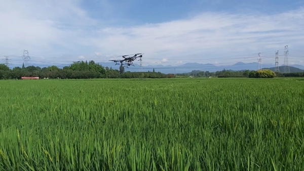 一架无人机在杂交水稻上方约一两米处低飞,螺旋桨卷起的气流在稻田里划出一道道波浪,激扬起每一株雄性父本水稻花粉,使花粉均匀地飘向雌性母本水稻。