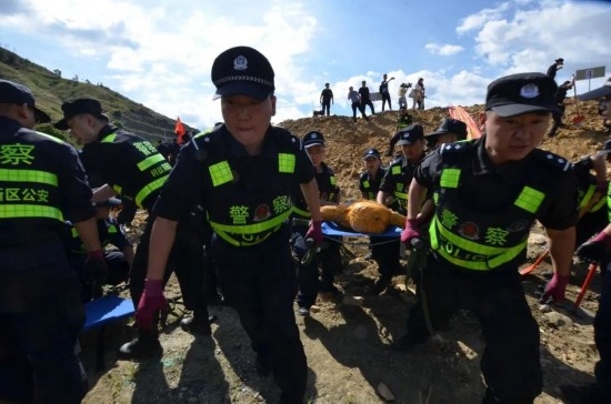 经过无人机勘查,民警发现东面山头有大量被困群众,西面滑坡地带有被掩埋群众。每个应急处突队分成两个救援组,一组前往滑坡地带救援被掩埋群众,另一组前往山头救援被困群众,检验全市公安机关应急处突队伍综合实战能力。经过紧张处置,受灾群众全部救援完毕。
