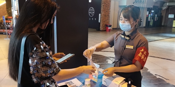 因为刚恢复营业,观众并不多,来来回回的大都是工作人员,保洁人员拿着消毒液正在喷洒。观众进入影院后,经过测量体温、登记个人信息等环节后,在工作人员的指导下,在自动取票机上取票,等待入场。