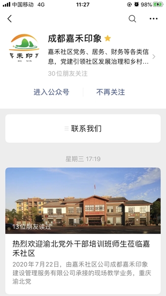四川在线消息(记者 丁宁)黄龙溪镇嘉禾社区为适应党建引领社区发展治理的需要,打造智能、高效、便民的“智慧”社区,拉近居民与社区之间的距离,打通联系社区居民的“最后一公里”,为嘉禾社区社区发展治理和乡村振兴提供助力。2019年3月21日,嘉禾社区微信公众号——“成都嘉禾印象”正式成立,截止今日,社区微信公众号已运行一年零四个月。社区通过“成都嘉禾印象”微信平台发布党建引领社区发展治理动态、政策宣传、活动通知、网上学习等各类事宜,居民通过订阅微信公众号就能随时掌握社区动态,并能通过平台进行办事咨询,一个微信公众号,实现了居民零距离获取社区信息的服务目标,小平台起了大作用。