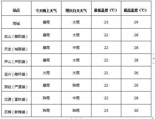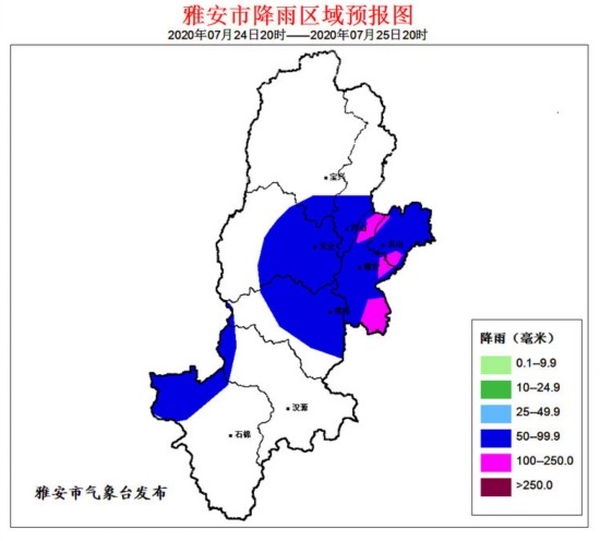 7月24日下午,雅安市气象台发布暴雨蓝色预警:预计24日傍晚到25日白天,雅安市有一次明显的降雨天气过程,雨量普遍为中到大雨(20-40mm),其中雨城、名山、天全、芦山、荥经的部分地方有暴雨(60-80mm),个别地方可能超过120mm;宝兴南部、汉源、石棉的个别地方有大到暴雨(30-50mm)。降雨时可能伴有雷电和短时阵性大风。请注意防范强降水、雷电和大风带来的不利影响。