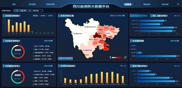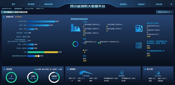 在省级大数据平台的界面,绵阳市消防监督人员可以获得支队权限,“一张图”掌握全市火灾分布、监督执法、网格排查、维保检测等现有消防各系统相关信息,动态跟踪接入消防物联网平台企业的设备状况,全面了解全市范围消防执法动态,实时展现各区域安全指数排名。
