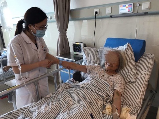 7月27日,住在成都市第五人民医院神经内科刘婆婆面色红润、笑容满面,正在保姆的陪伴下输液。看到医生到来,她立即举起右手,做着伸手、弯手、抓、握等动作,“你看,我现在很灵活了。”