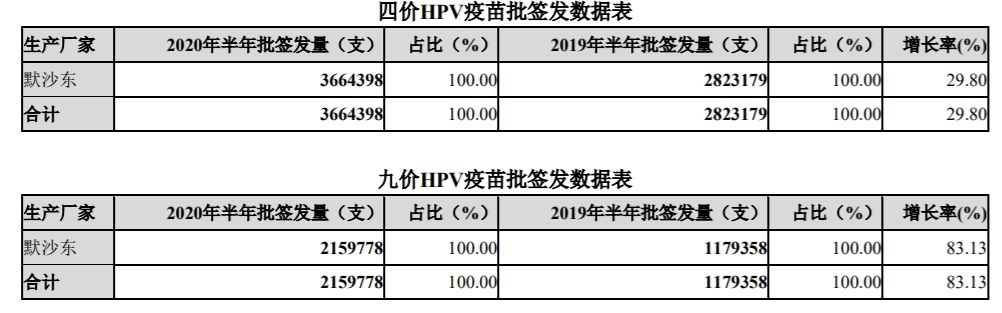 智飞生物代理默沙东HPV疫苗在2020上半年的批签发量