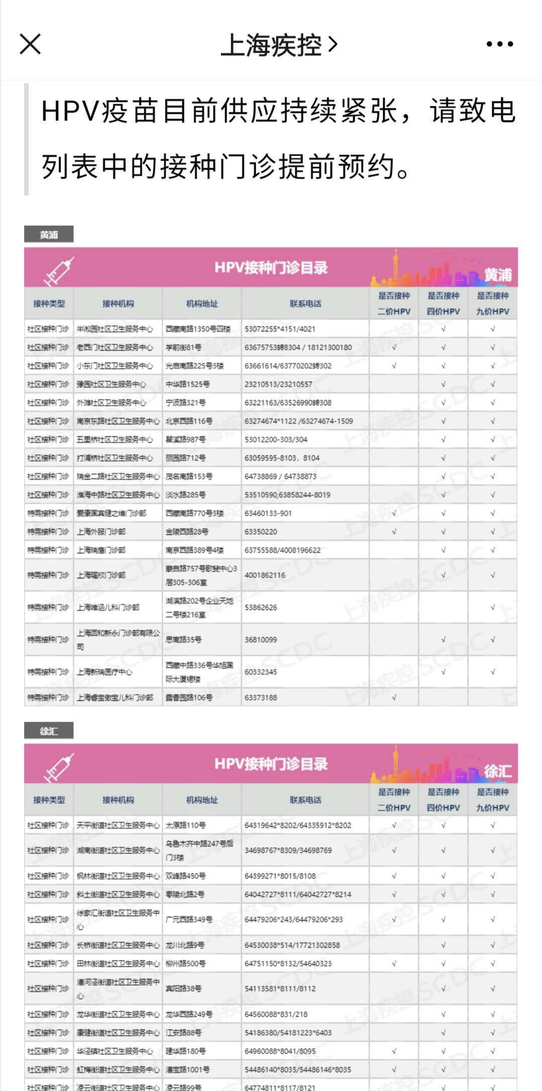 上海疾控官方公众号设立了HPV疫苗接种门诊入口,上面也提醒,HPV疫苗目前供应持续紧张,请致电列表中的接种门诊提前预约。