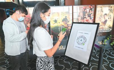 观众在云南省昆明市北辰财富中心影院入口处扫健康码。陈欣波摄(新华社发)