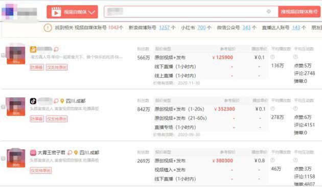 知名“大胃王”吃播“浪味仙”在快手和抖音分别有2936万、3744万粉丝,平均每条视频播放量达1200万,其发布一条广告视频报价12.8万至64.99万元不等,其在某知名接单平台已接32单广告。