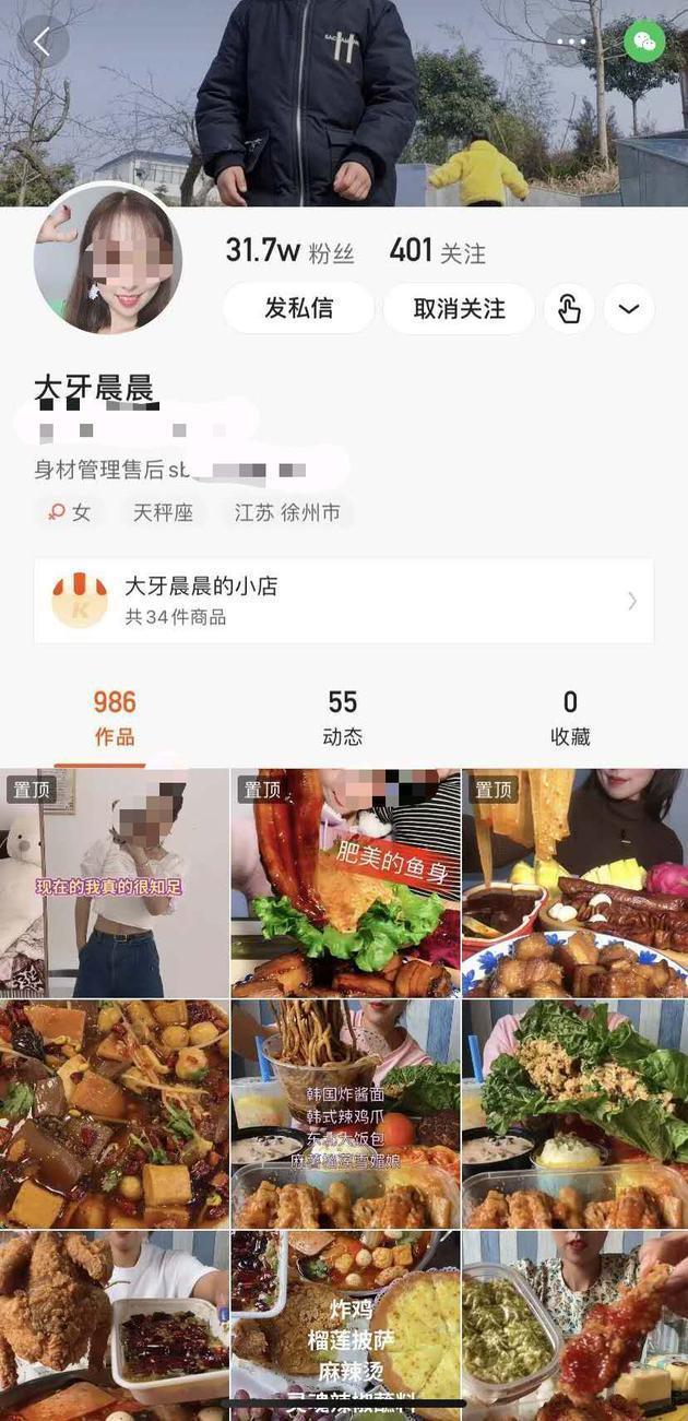 “大牙晨晨”发布的大胃王吃播视频,其中翻车视频已被删除。手机截图
