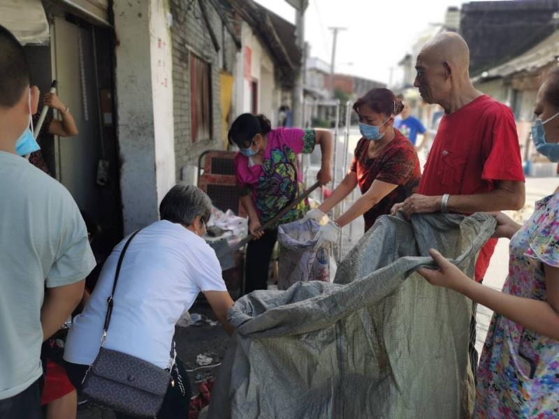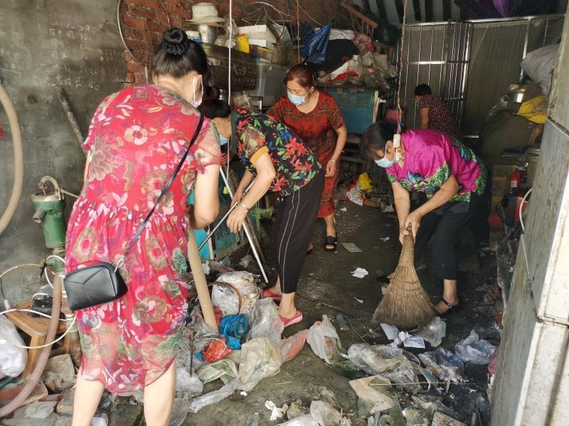 志愿者们主动与老人聊天,了解老人的生活状况,循序渐进告诉老人家中乱放杂物的危害,获得了老人的理解与许可,志愿者们立即行动,帮忙整理房屋、打扫卫生。党员志愿者、社区自组织、小学生志愿者合力将老人家中物品摆放整齐。“爷爷,这个瓶瓶都坏了,要割手,太危险了,我们给你换个新的。”小小志愿者崔萌汐拿着一个老旧的暖水瓶说道,在征得老人同意后,大家将无用的物品集中丢弃后,便对房屋进行清扫和消毒。人多力量大,不一会儿,房屋变得干净整洁,当老人看到家里焕然一新,十分高兴,连说:“感谢社区、感谢你们!”