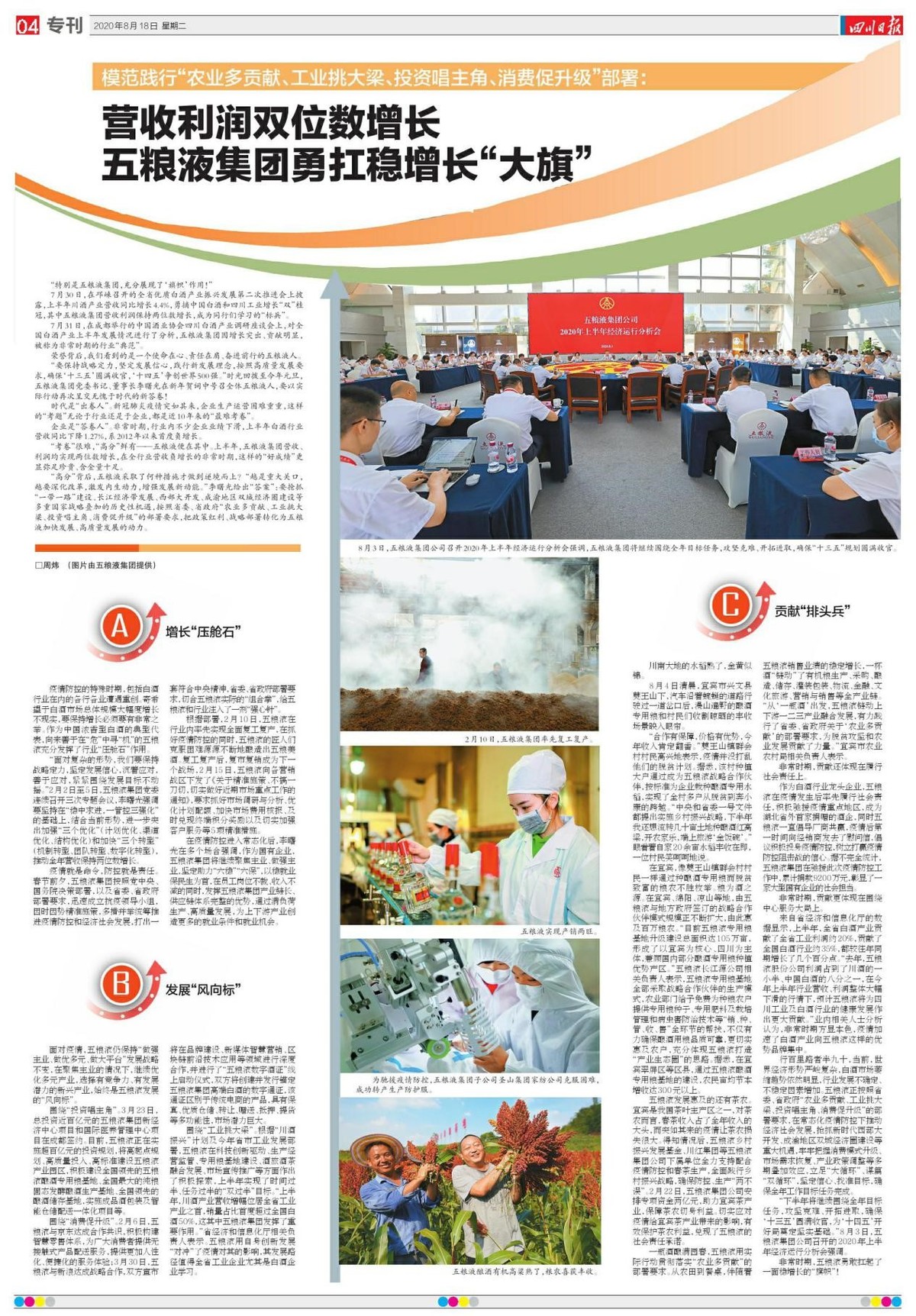 作为全省“5+1”现代产业体系重要优势企业,今年上半年,五粮液集团勇扛稳增长“大旗”,营收利润实现双位数增长,充分展现了“旗帜”作用,为川酒产业乃至四川工业的稳定增长作出了积极贡献——今天,中共四川省委机关报《四川日报》,在重要版面用整版聚焦“榜样”五粮液,全文以《模范践行“农业多贡献、工业挑大梁、投资唱主角、消费促升级”部署——营收利润双位数增长 五粮液集团勇扛稳增长“大旗”》为题,从增长“压舱石”、发展“风向标”和贡献“排头兵”三个纬度,全面解析五粮液逆市增长的内生原动力和外在驱动力。