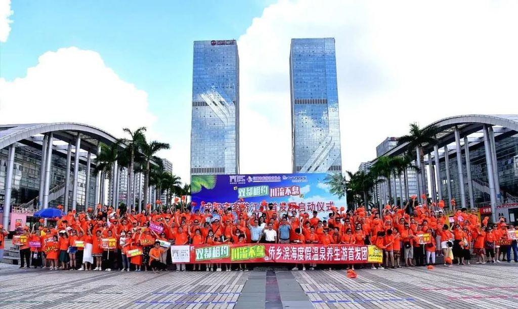 “江门,我们来啦!”8月16日上午9点,“双都相约 川流不息”成都宾客游江门首发团启动仪式在江门五邑华侨广场举行,首批150余名成都游客将开启为期五天的侨乡滨海度假温泉养生之旅。