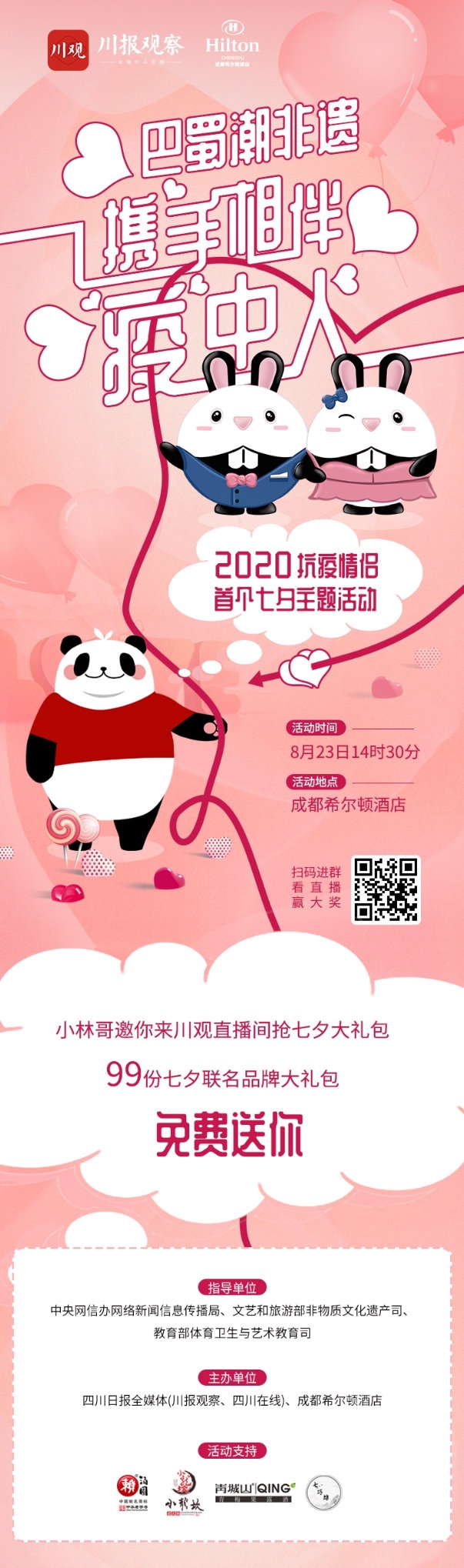 8月25日即将迎来中国传统节日七夕情人节,与以往不同的是,今年的七夕也是2020年抗疫以来的首个中国传统情人节。8月23日,在中央网信办网络新闻传播局、文艺和旅游部非物质文化遗产司、教育部体育卫生与艺术教育司的指导下,四川日报全媒体(川报观察、四川在线)将携手成都希尔顿酒店、赖汤圆、小龙坎、青城山果酒、七巧坊汉服馆,共同举办一场以“携手相伴‘疫’中人”为主题的2020抗疫情侣首个七夕主题活动。