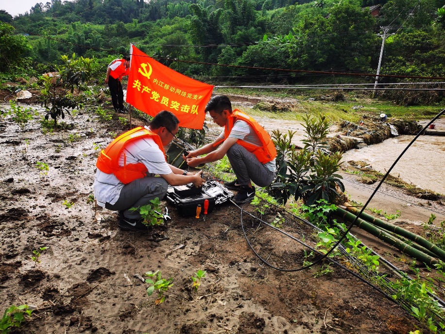 在广汉,9支移动党员突击队用皮划艇在新平镇往返20次,将应急设备送达目的地;在汉源,党员突击队用砍刀、安全绳深入山区,恢复坭美彝族乡通讯信号;在金堂,党员突击队在洪峰到达之前完成了应急预案的制定……