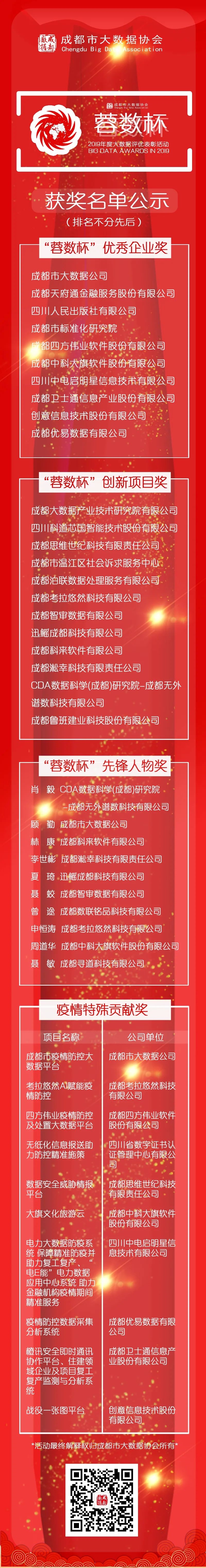 名单于今日正式公示。在此,协会祝贺获奖单位和个人,同时,对参与并支持本届“蓉数杯”的企业单位和个人表示感谢。相关的奖杯及证书,协会将陆续颁发到获奖企业单位和个人手中,请获奖单位耐心等待。