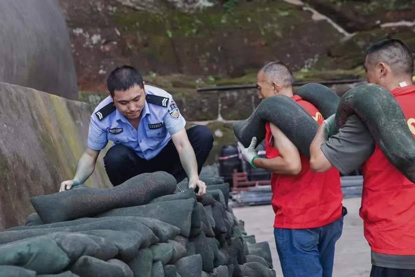 就是这种义务感,让他在8月17日深夜在佛脚平台摔了好几跤,全身毫无保留的湿透。“与时间赛跑,和洪水争分夺秒。”钟声回忆,无法形容当晚狂风暴雨的力量,只觉得打在身上很痛,视线相当模糊。因为暴风雨来得相当快,江面水位上涨很快,他与约150名工作人员、民兵要在洪水漫过佛脚平台之前,把计划围绕在佛脚下的2000个沙袋堆砌好,才能减轻洪水对大佛本体的冲撞、掏蚀。