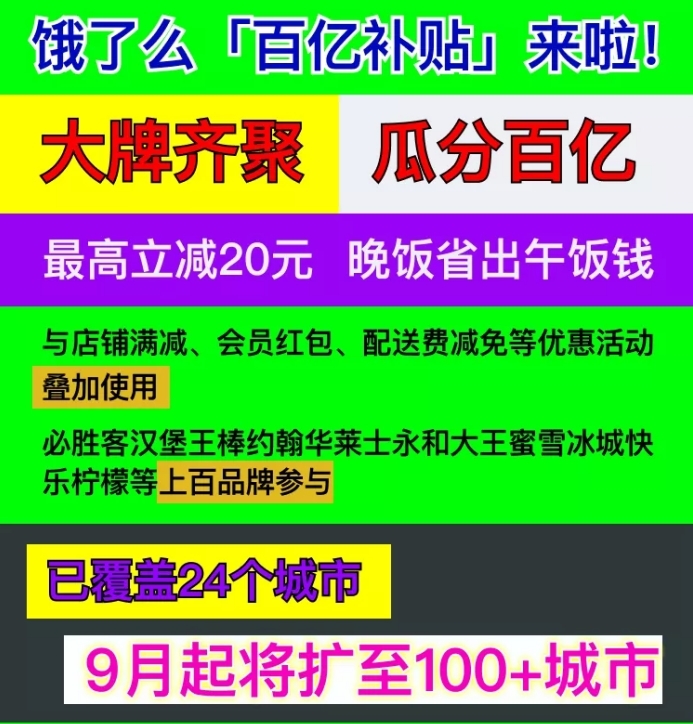 饿了么方面表示,“百亿补贴”将成为常态化补贴行动,可与红包、满减叠加使用,每单外卖最高再省20元。9月起,“百亿补贴”还将加码,重点覆盖城市将从成都、北京、上海、杭州、广州、西安等24城扩展到100城以上。