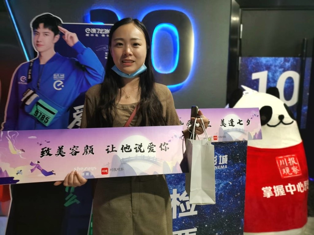 除了线上派送环节,此次活动还特别挑选了线下点位与粉丝近距离互动。在成都春熙路中影和悦影城,不少前来观影的年轻情侣参与到活动中来,在观影前的闲隙,与川报观察吉祥物“川宝”亲密互动,还拿起此次线下点位特别提供的七夕金句KT板合影留念,发布微博/朋友圈。