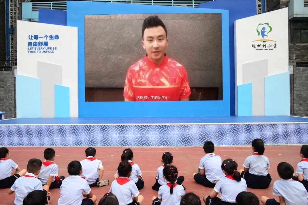 在成都市泡桐树小学,校长黄艺竹从爱国心到家乡请,从抗疫精神到成都大运会的举办,从天府文化到泡小精神,给孩子们提出了殷切期望,希望孩子们怀着一颗赤诚中国心,当好大运会小小东道主,做友善乐观的成都人。