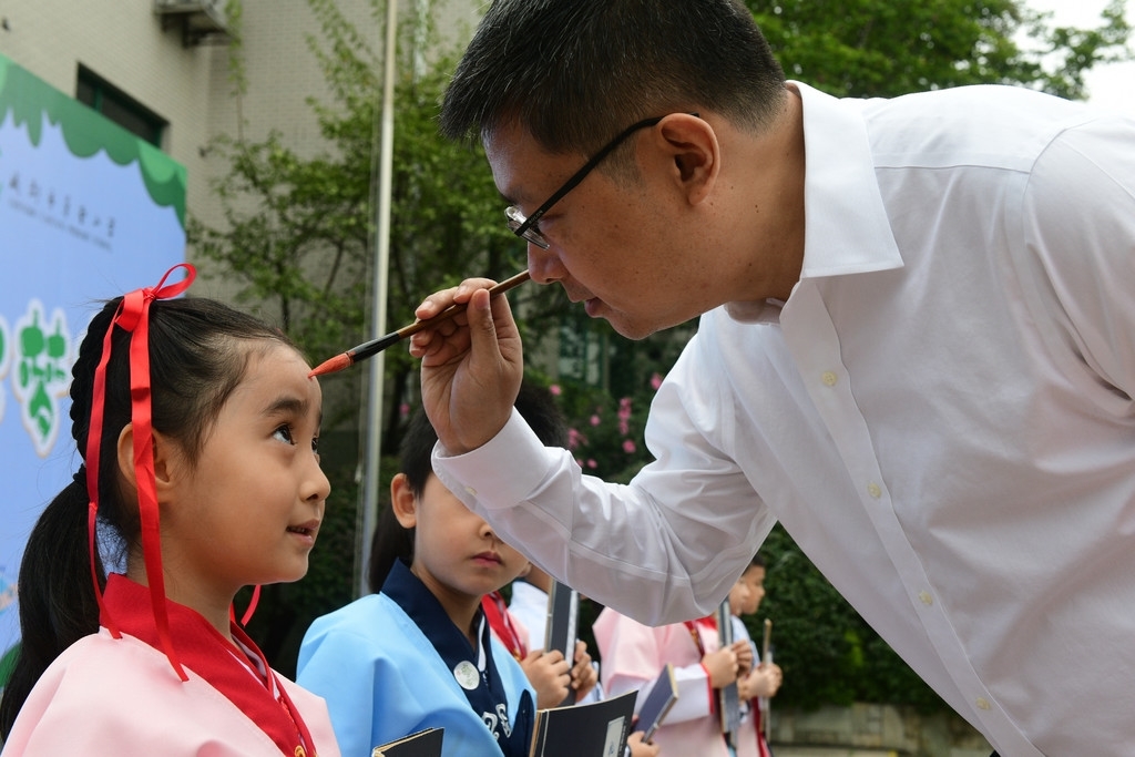 在成都市草堂小学的开学典礼上,校长金波在孩子们的额头上点了一颗朱砂痣。“痣通智,寓意着孩子们心明眼亮,在求学的道路上好读书,读好书,送上老师对新生的美好祝福和殷切希望。