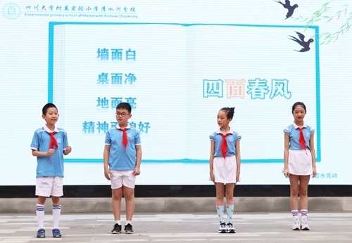 2020年9月1日,开学第一天,川大附小清水河分校师生及一年级家长代表相聚校园,以“爱成都,迎大运”为主题举行了隆重的开学典礼。