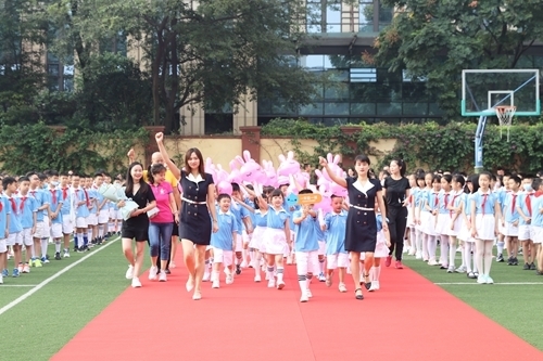 在一段充满童趣的“大运会”吉祥物动画视频后,彩带缤纷,礼花灿烂,一年级教师和孩子在家长代表的见证下,携手入场,响亮的口号、蓬勃的朝气,展现了一年级的新风貌。