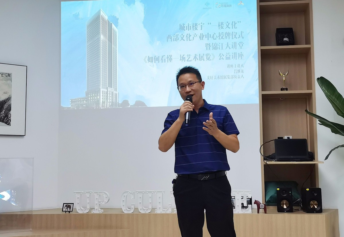 授牌仪式后,锦江大讲堂开讲,青年策展人、文轩美术馆展览负责人吕继龙,为现场嘉宾带来了主题为《如何看懂一场艺术展览》的精彩讲座。