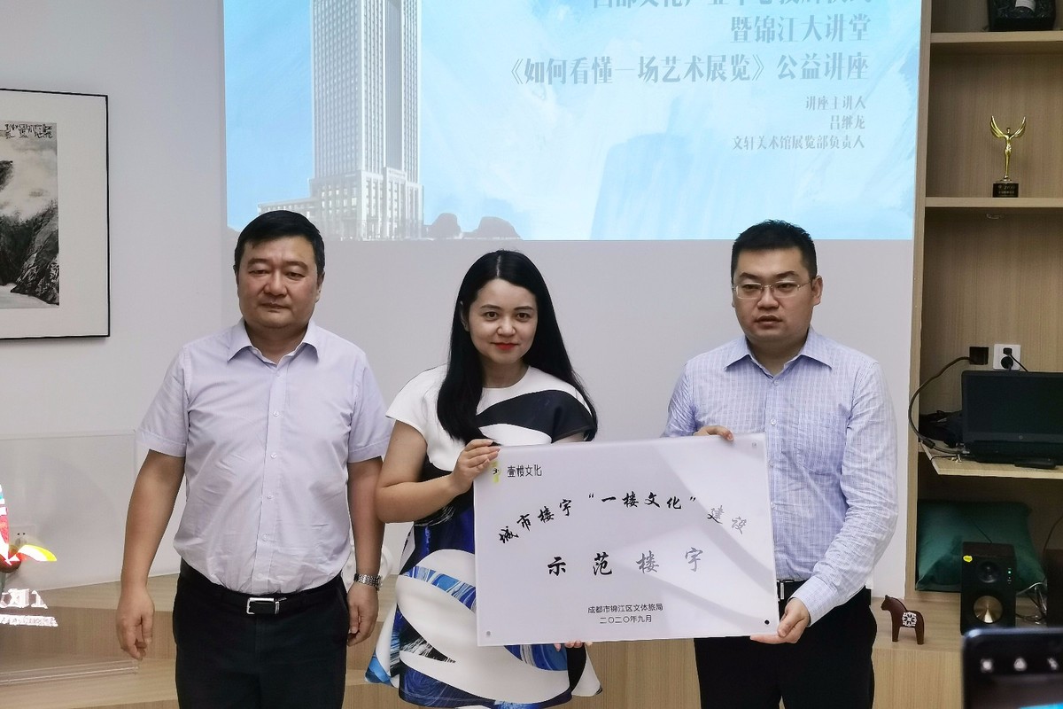 9月8日,城市楼宇“一楼文化”西部文化产业中心授牌仪式暨锦江大讲堂公益讲座在西部文化产业中心招商中心圆满举办。成都市锦江区文体旅局正式为西部文化产业中心写字楼大厅“一楼文化”项目授牌,标志着锦江区文化馆、四川川报上行文化发展有限公司、COOC中海商务成都三方携手整合政府与社会机构的优质资源,正紧密合作将西部文化产业中心打造成城市文化艺术高地。