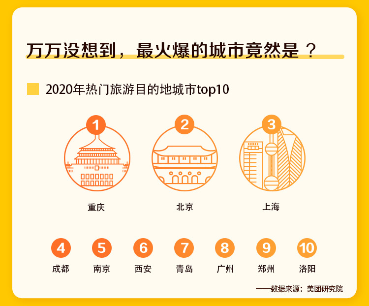 9月22日,美团研究院发布的《2020年中秋国庆假期旅游消费预测报告》(以下简称《报告》)指出,今年国庆假期的住宿消费可能恢复至同期水平,甚至有望出现小幅增长,旅游景区消费则可能恢复至90%左右,旅游消费将有望达到疫情后的新高点。假期全国热门旅游目的地城市前十分别为重庆、北京、上海、成都、南京、西安、青岛、广州、郑州、洛阳。