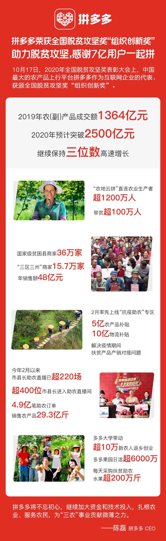10月18日,记者从拼多多获悉,2020年,拼多多农(副)产品成交额预计将突破2500亿元。