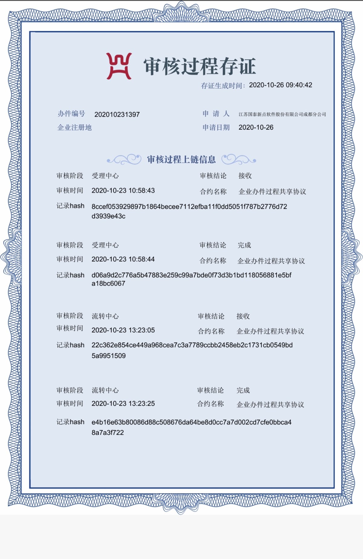 “为了实现企业开办链上办,我们已经建立起企业开办审批事项的‘证照链’‘材料链’‘过程链’‘管理链’‘审计链’,实现审批事项全生命周期的环环相链。”武侯区行政审批局相关负责人举例说,就企业开办而言,在过去需要受理、审查、核准、录入、纠错、归档等6个环节,其中审查、核准、录入、纠错四个环节需要人工审核。如今运用区块链后,将化繁为简,这四个环节通过链上自动核验,不再需要对链上数据校验真伪,大幅降低核验难度,大大缩短了事项处理时间,缩短核验时间30%。另外在受理方面,信息通过链上自动获取,材料可以复用,让企业提交的材料减幅达30%以上。且在线填报过程中可实现自动填报,不再需要手工填写。同时,审批结果自动上链归档,并形成证照卡包,让企业可通过二维码自主查询。