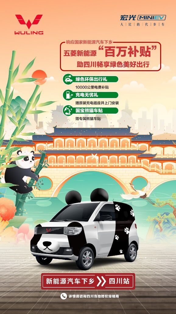 为鼓励更多消费者选择新能源汽车低碳出行,上汽通用五菱结合四川当地情况,贴心推出“百万补贴”计划。即日起至2020年12月31日,四川省消费者购买宏光MINIEV、宝骏E100、宝骏E200、新宝骏E300/E300Plus任一车型,即享3重礼遇,包含: 10,000公里电费补贴(按每公里使用成本0.05元计算)、赠送充电插座。此外,上汽通用五菱以萌态可掬的大熊猫为灵感,推出专属定制熊猫车贴,让四川用户开“熊猫车”,别有一番萌趣。