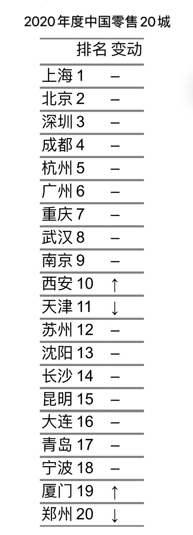 11月5日,第一太平戴维斯等机构联合发布的《2020年度中国零售20城报告》(以下简称“报告”)显示,上海、北京、深圳居前三位,成都位居全国第四位。