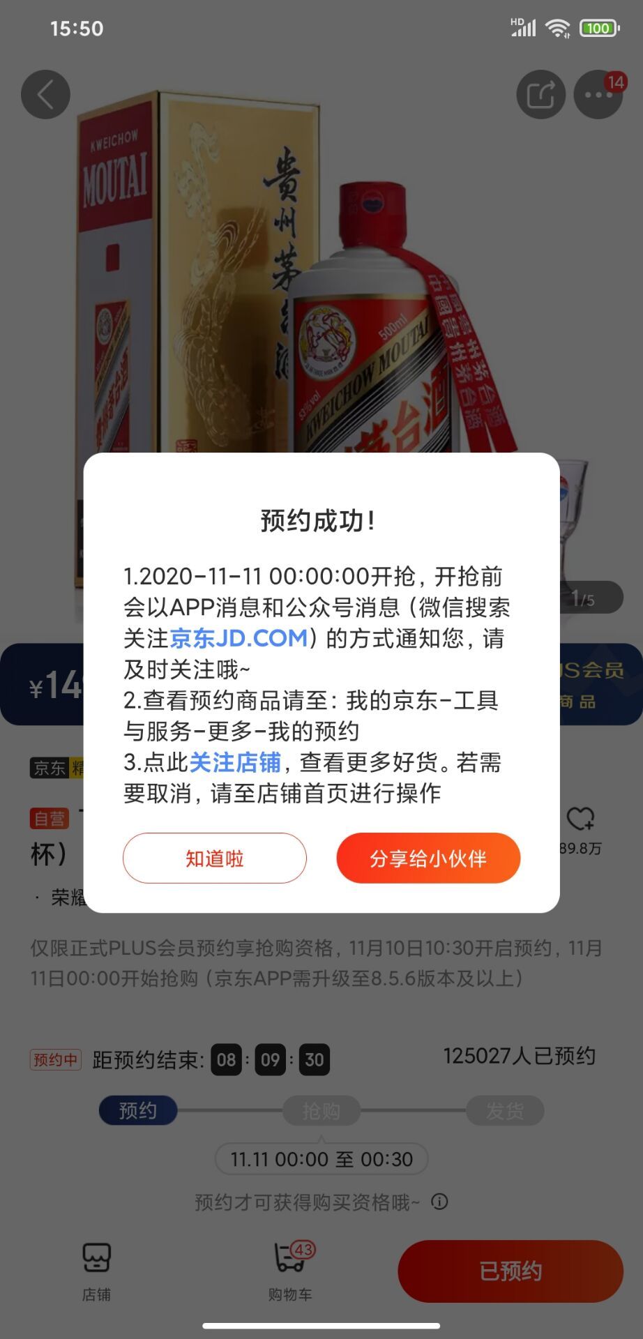 “从11月1日到现在,我每天都在预约抢购,仍不得中!”“多个平台,我都上了闹钟,提前5分钟登陆开始抢,运气不好,未成功过。”“经常都是一到点,开始抢购便已售罄,不知是真的秒空,还是只是噱头。”在记者随机采访中,不少参与茅台预约抢购的消费者表示,从双十一活动开始到现在,每天都准时准点开始抢购,但是每次的结果,均是“未抢中”,火爆程度堪比春运时抢火车票。不过也有消费者表示自己成为了“幸运儿”。