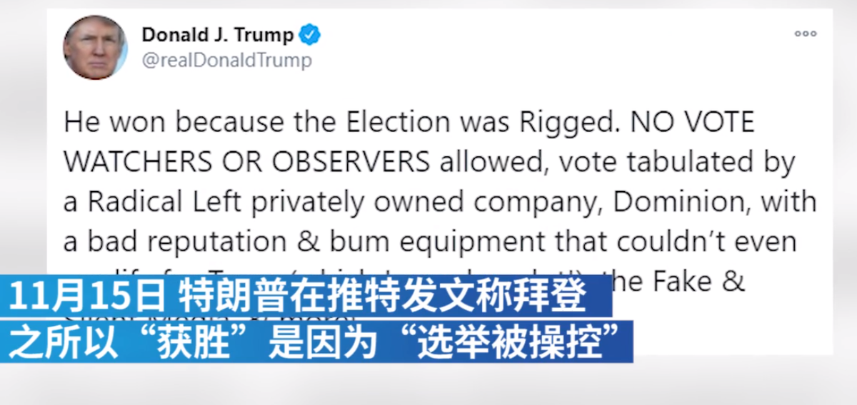 美媒:特朗普发文“选举被操纵”,却首次称拜登“大选获胜”