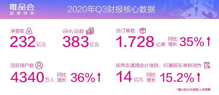 近日,品牌特卖电商唯品会披露了其未经审计的2020年第三季度财务报告。财报数据显示,唯品会第三季度净营收达232亿元人民币(约合34亿美元),同比增长18.2%,活跃用户超4340万人,同比增长36%。财报显示,唯品会各项数据持续稳健向好,尤其是活跃用户实现高速增长。至此,唯品会已保持32个季度连续盈利。