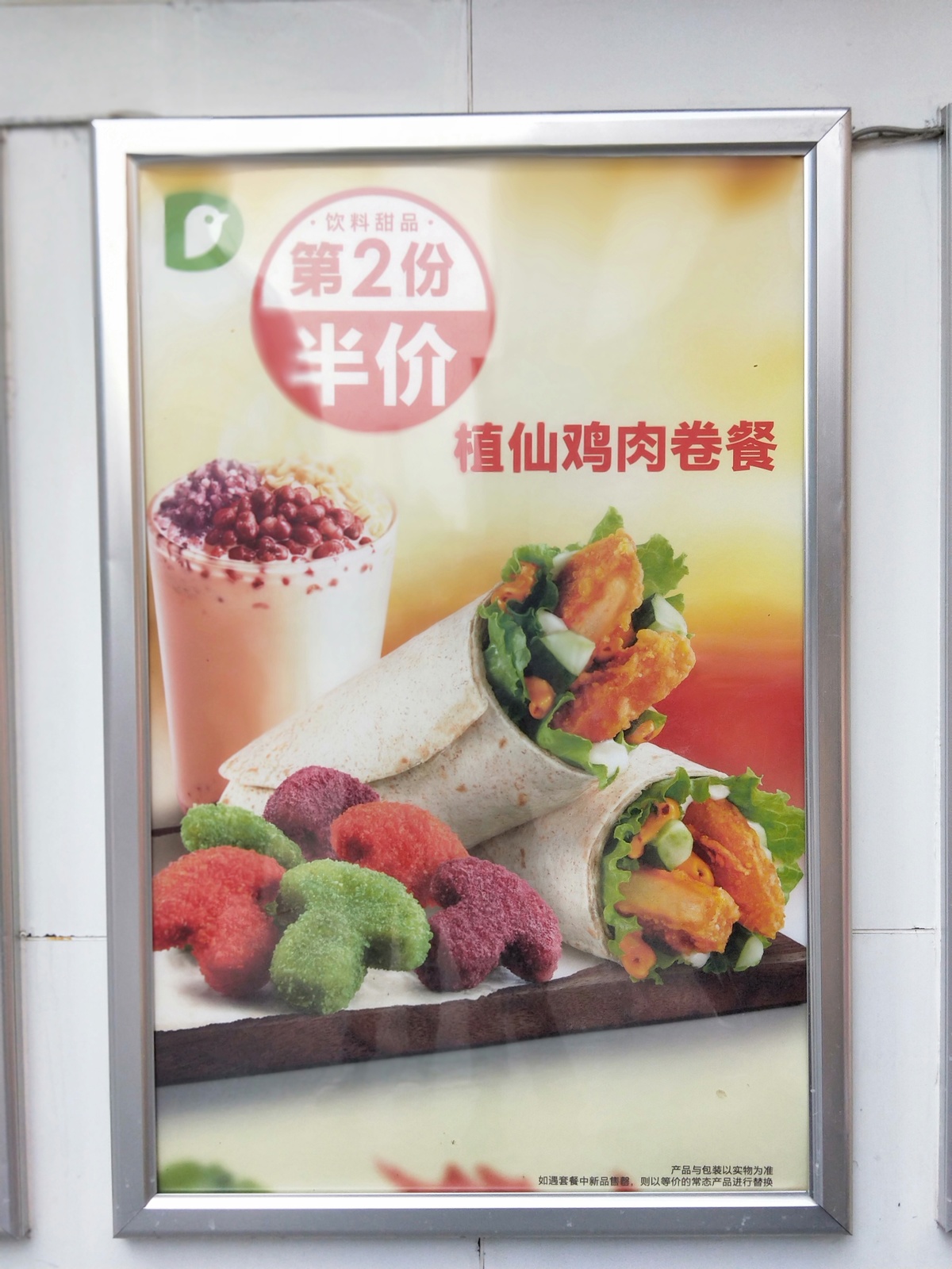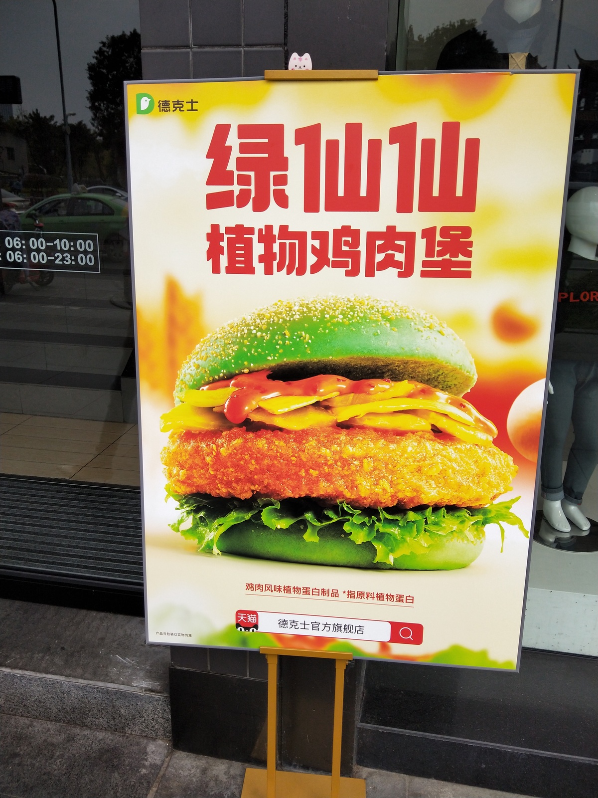 店内随处可见的宣传海报上,主打产品绿仙仙植物鸡肉堡看起来与普通汉堡没有区别。但海报下方的一行说明透露了它的真实身份:鸡肉风味植物蛋白质,零胆固醇、低保和脂肪。