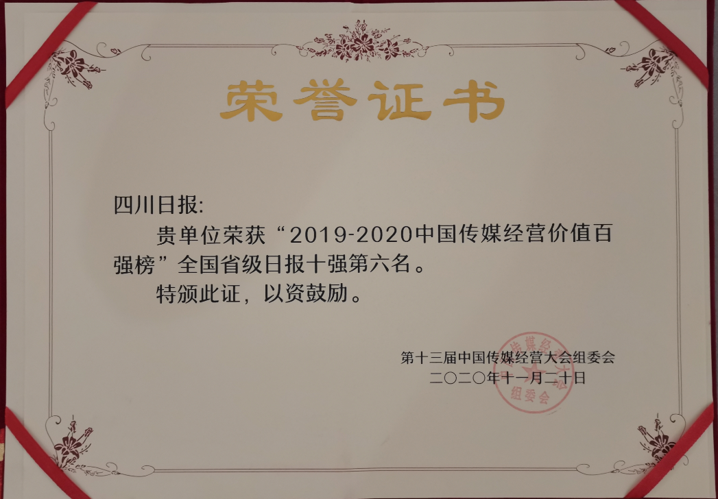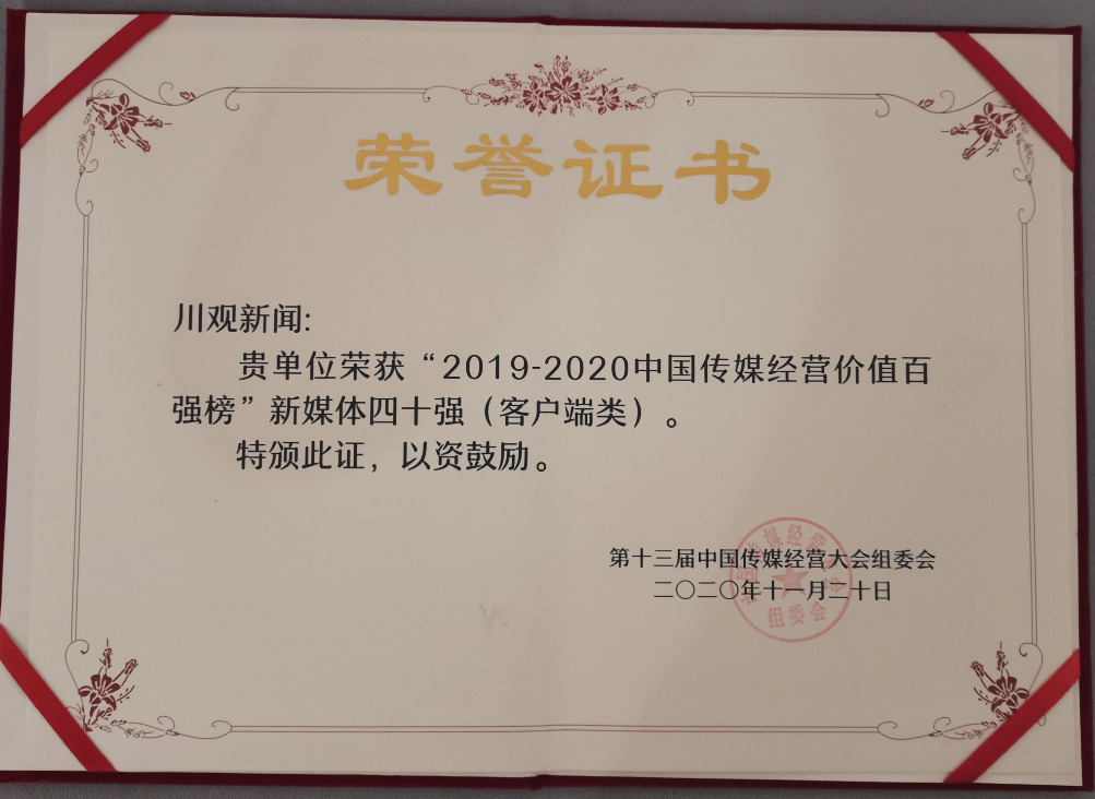 11月20日,第十三届中国传媒经营大会暨2019-2020中国传媒经营价值百强榜发布会在厦门召开,来自中央、省、市部分新闻单位负责人,业界专家和知名企业代表近百人参加会议。在2019-2020中国传媒经营价值百强榜”发布环节,四川日报社、四川在线、封面新闻分别获得全国省级日报十强和新媒体四十强。