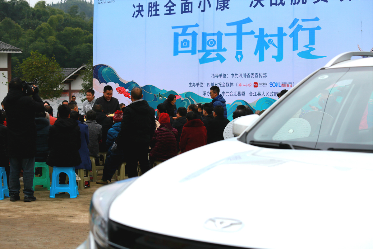 11月25日下午,由凯翼汽车全程战略支持的四川日报全媒体“决胜全面小康 决战脱贫攻坚”大型报道“百县千村行”采访活动来到了泸州市合江县榕山镇回洞桥村。一曲《扶贫路上》开启了一场极有川南特色的“乡村坝坝会”,上百名群众围坐在村活动室前坝子,和当地县委书记、镇党委书记、回洞桥村第一书记一起,听村民讲述脱贫故事,共同畅想小康生活。