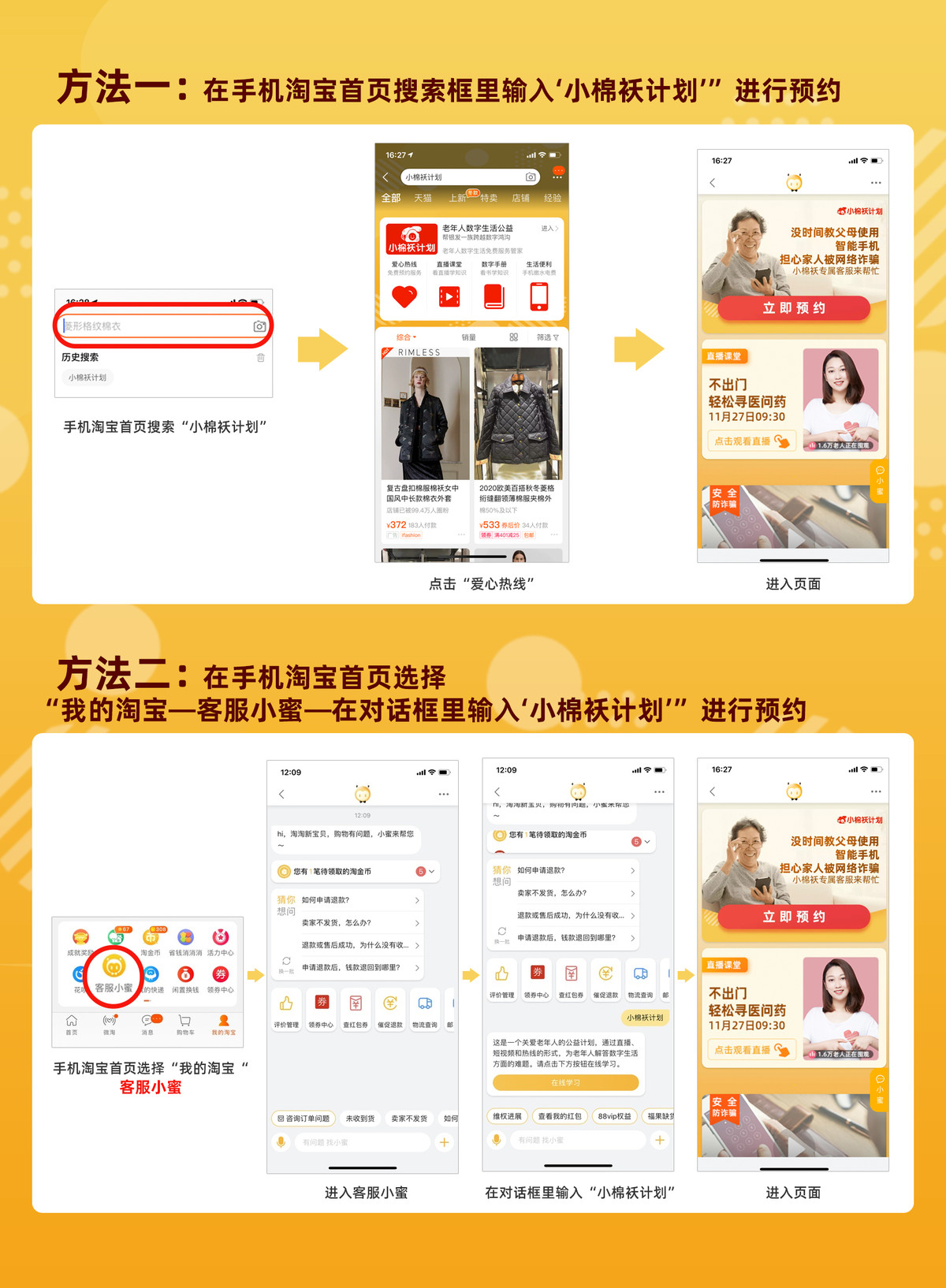 也可以在手机淘宝首页选择“我的淘宝—客服小蜜—在对话框里输入‘小棉袄计划’”进行预约。预约成功后,阿里CCO的客服小二们,会在一周内回访,进行一对一电话服务。