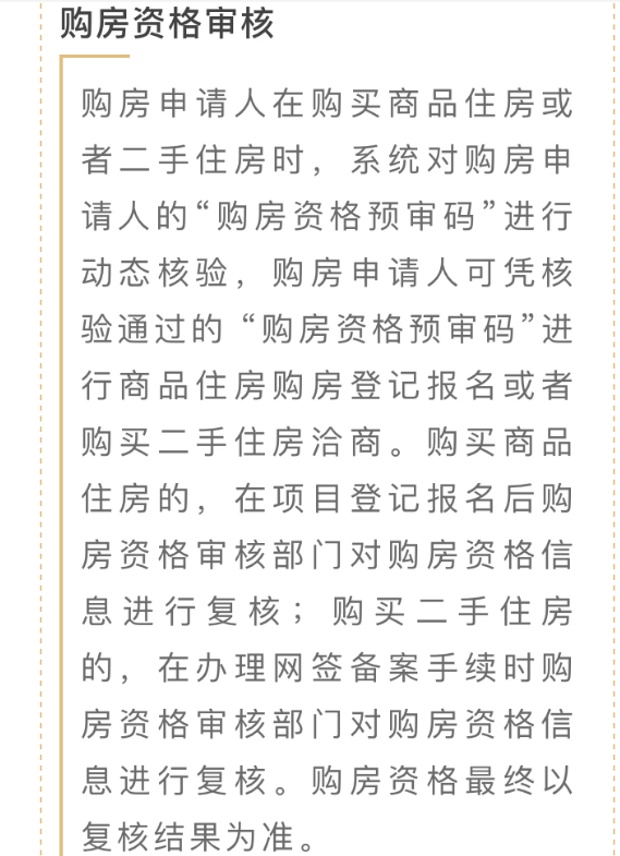 第三步,经审核符合相应区域购房条件的购房人信息,生成“购房资格预审码”,预审结果以短信、手机应用客户端推送、网站查询反馈等方式告知购房申请人可以购房的区域和购房资格类型。