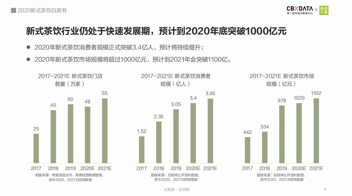 12月3日,第二届“饮”领者峰会在上海举行,奈雪的茶联合CBNData发布了《2020新式茶饮白皮书》(以下简称《白皮书》),数据显示,新式茶饮迈入数字化3.0阶段,预计到2020年底市场规模将突破1000亿元。