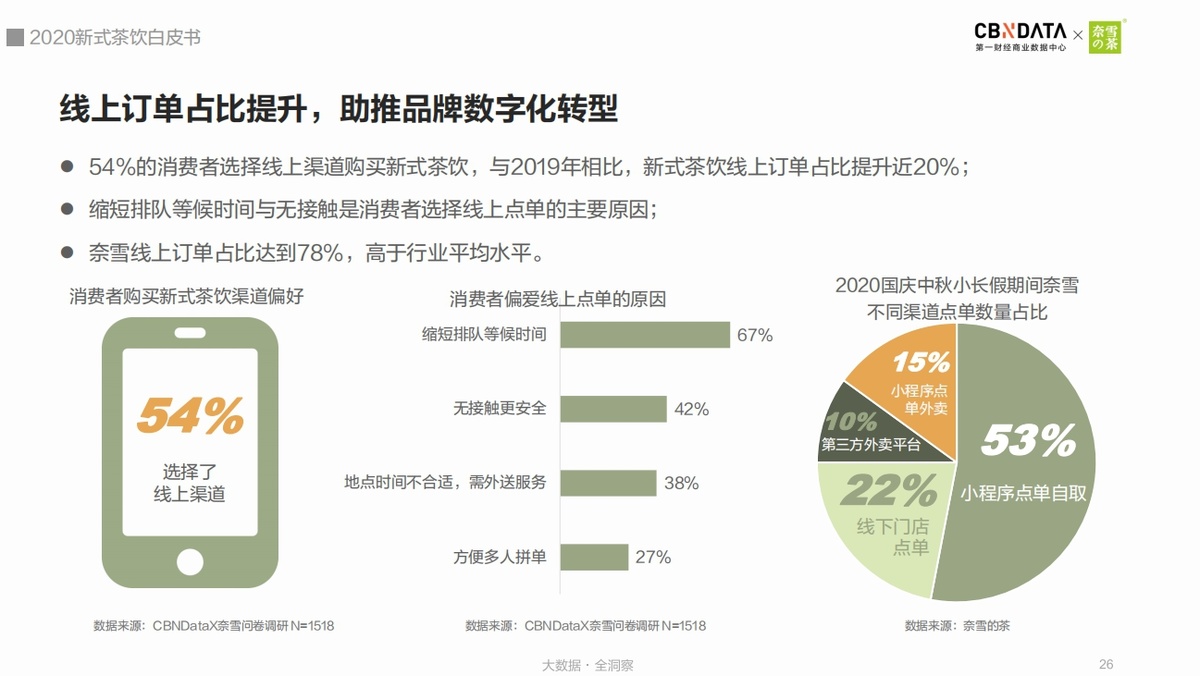 据了解,2020年,共9家新式茶饮品牌组建了数字化团队,其中奈雪的茶、喜茶数字化团队超百人。自2020年奈雪、喜茶入驻天猫之后,新式茶饮天猫线上销售额增长近2倍,新式茶饮品牌旗舰店累计浏览人数超过千万,较去年增长3倍。奈雪、喜茶今年均首次参与“双十一”,双双斩获超千万销售额。