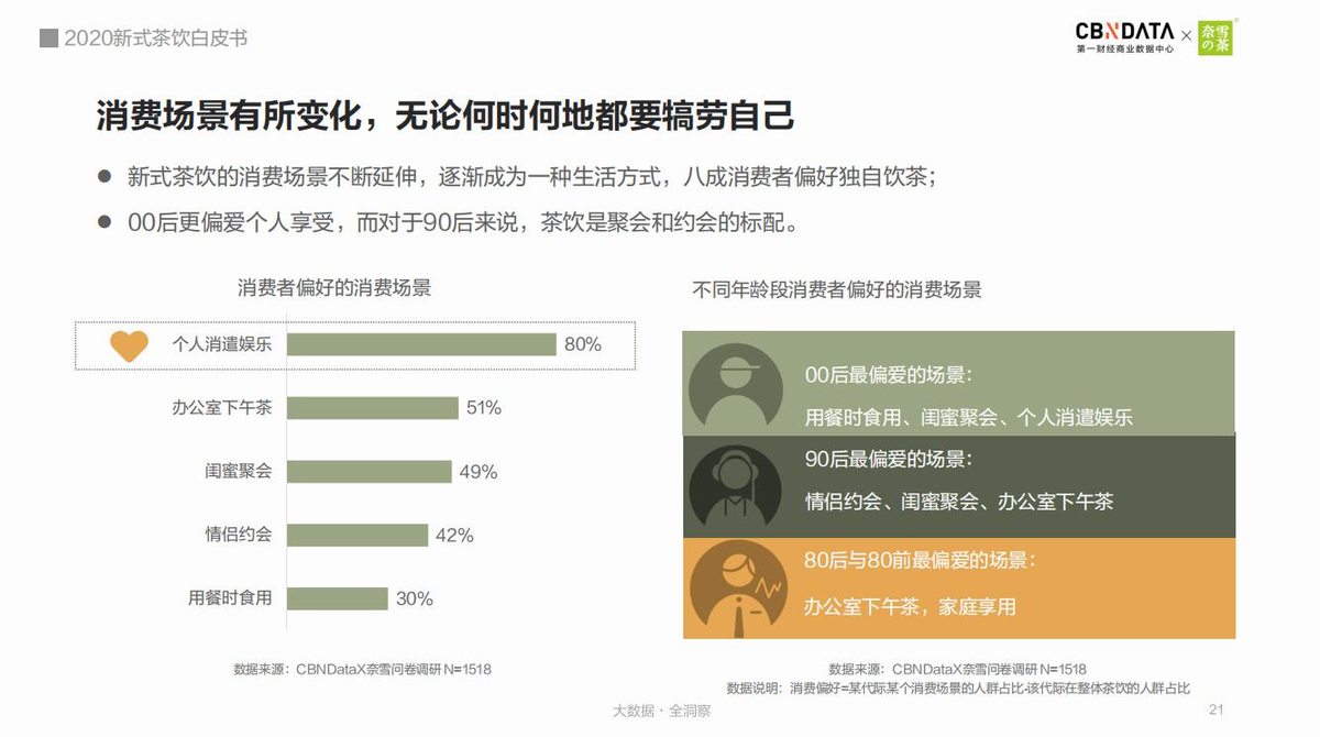 超八成的消费者独自一人时也会消费新式茶饮,其中,00后偏爱在用餐的同时饮用茶饮。茶饮是90后约会和聚会的标配;80前和80后则偏爱在办公室下午茶以及和家人在店内享受茶饮。可见新式茶饮已经渗透消费者日常生活多个场景。