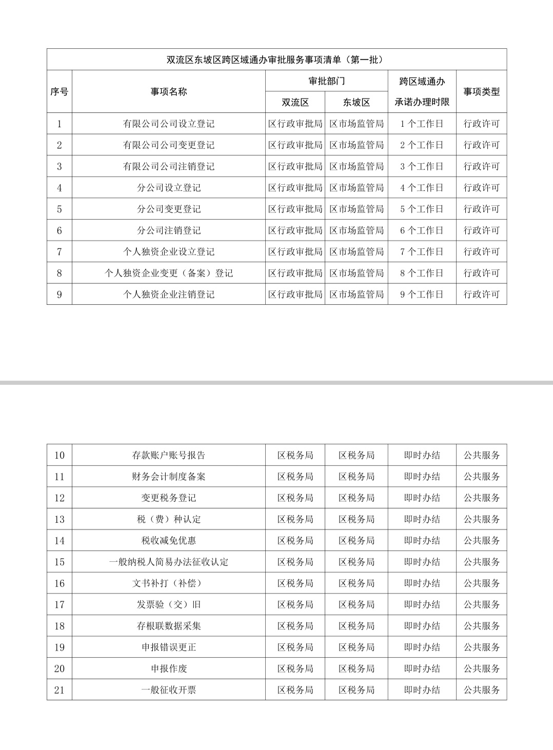 双流区东坡区跨区域通办服务首批事项清单,包含有限公司公司设立登记、有限公司公司变更登记、有限公司公司注销登记、增值税预缴申报等62项服务,接下来,双流区东坡区将分批次梳理、公布跨区域通办事项清单。同时根据企业、群众的需求,逐步扩大事项范围,建立“标准统一、异地受理、远程审批、协同联动”的政务服务新模式。