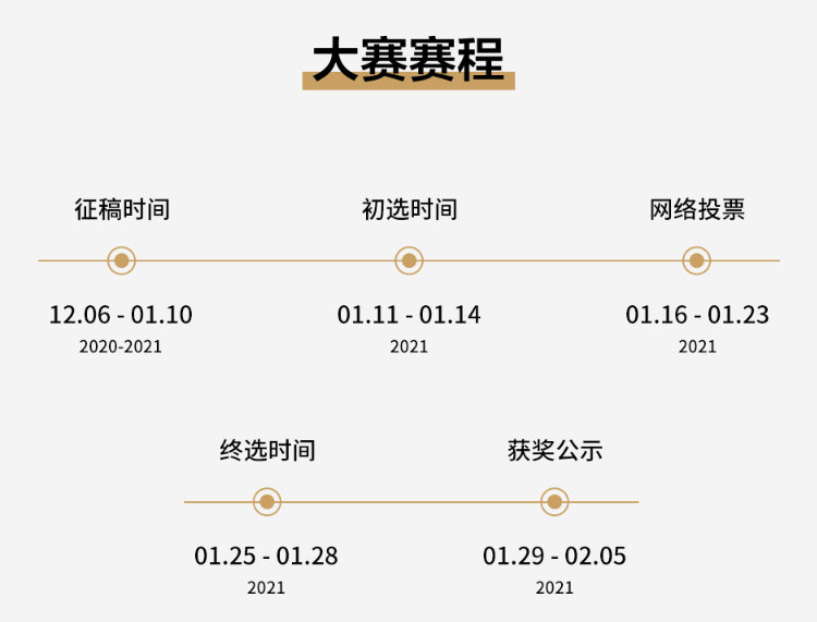 二、初选时间:2021年1月11日—2021年1月14日。此阶段根据设计板块类2个不同的设计方向,由主办方组织专家委员会对所有参赛作品进行初步评选,评选出50份入围作品。