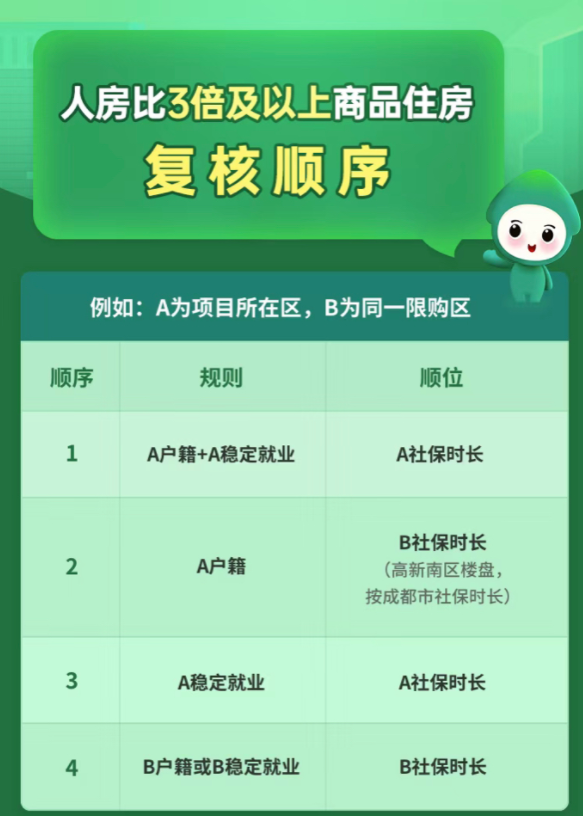 比如,以位于青羊区的光华壹号花园为例,该项目所有在售房源312套,无房家庭可摇号的房源大约218套,按照相关政策,此类购房者需要复核人数为654组。依次复核第一、二、三、四顺序,确定了654组后就会截止此类人群的复核,排在后面的购房者就没有机会参与了。如果想确保买到自己心仪的房子,不仅要靠运气还要对楼盘及自己的相关情况进行全方位的分析,然后再根据具体情况报名摇号,才有中签的机会。
