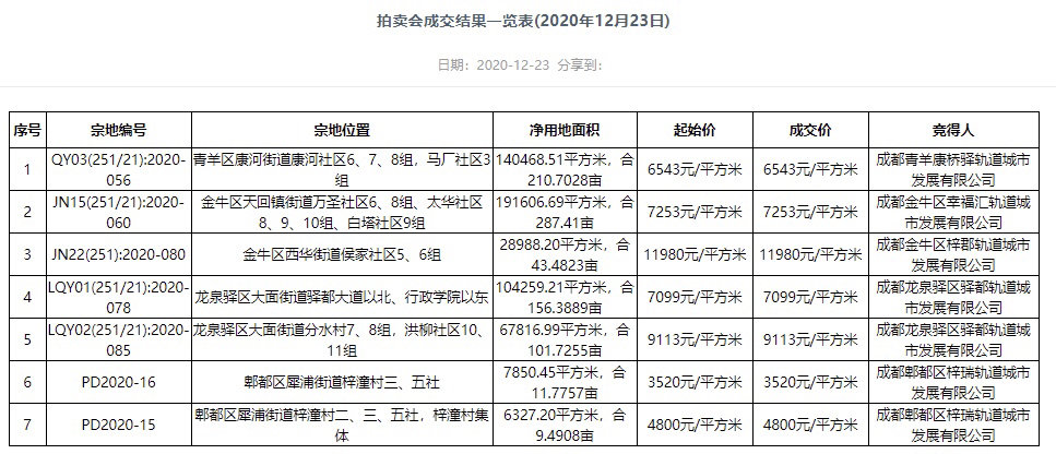 12月23日,在成都举行的土地拍卖现场,分别位于青羊区、金牛区、龙泉驿区和郫都区的7宗总面积约820亩的地块走上拍卖席。