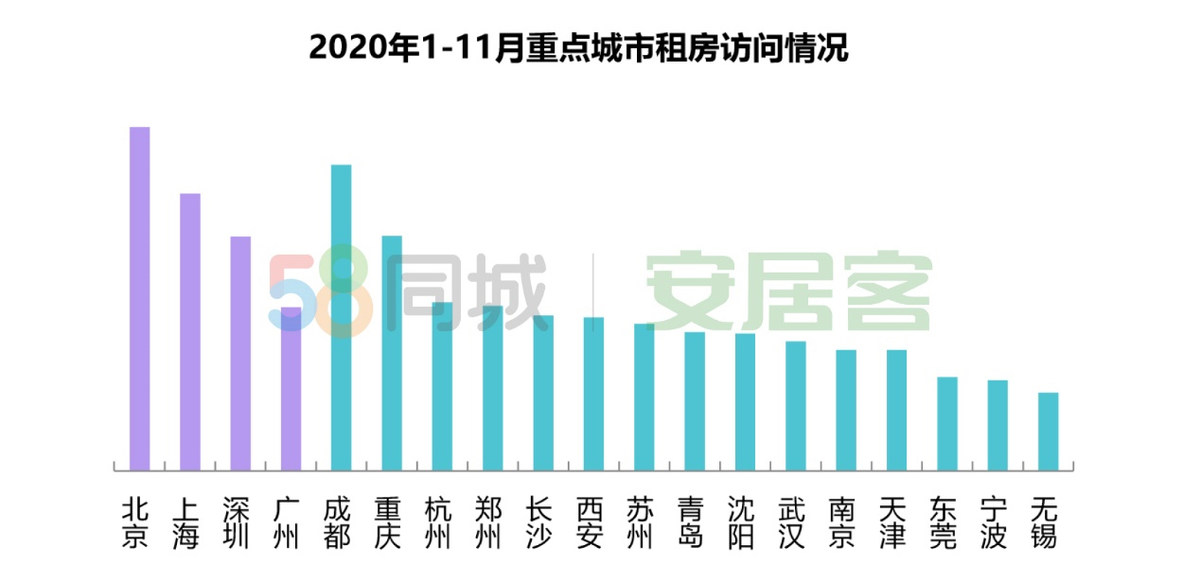 该报告显示,2020年全国租赁市场土地供应基本保持同期水平,上海在线租赁房源供应量居首位;流动人口及高校毕业生为当前住房租赁市场主要需求群体,租房市场年轻群体占比增加;新一线城市中,西部城市租房需求领先,成都居首位,排名全国第二,仅次于北京,西部代表城市重庆在新一线中位列第二。